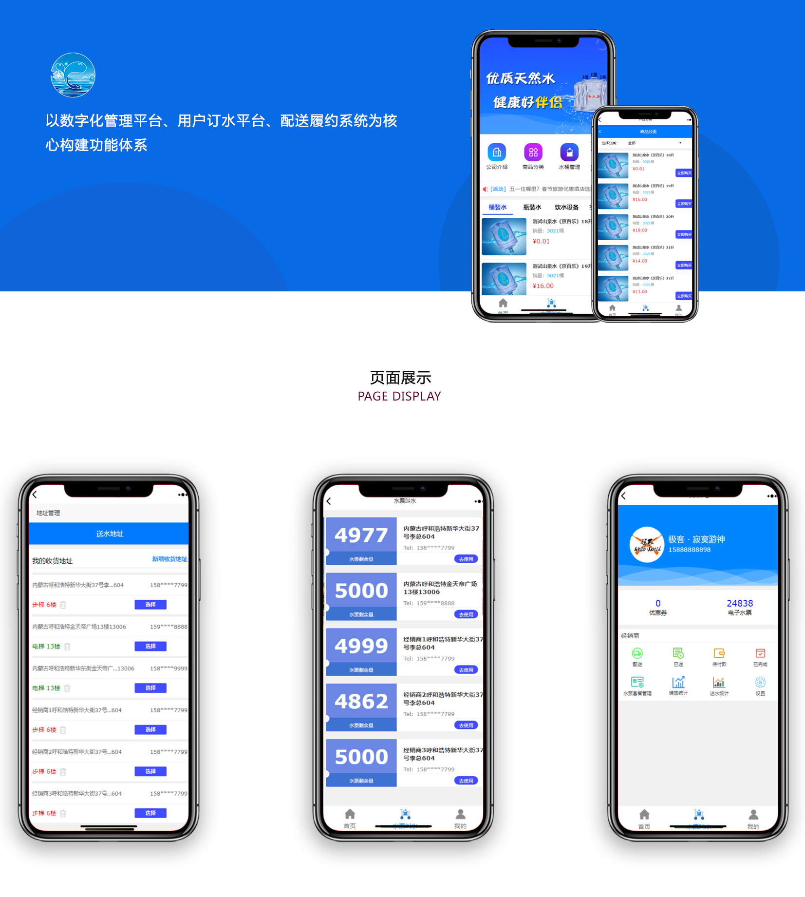 “圣水源到家”銷售一體化平臺圍繞訂水業務全流程,以數字化管理平臺、用戶訂水平臺、配送履約系統為核心構建功能體系。數字化管理平臺實現經銷商分級、客戶鎖客、商品管理、促銷配置、數據監控及水桶(押退/欠桶)管理;用戶訂水平臺提供商品篩選、引導下單、訂單追蹤、售后互動及水票/積分等營銷功能;配送履約系統支持智能導航、狀態更新、交付憑證上傳,還可統計配送績效用于薪酬核算,覆蓋訂水業務管理、交易、履約全環節。